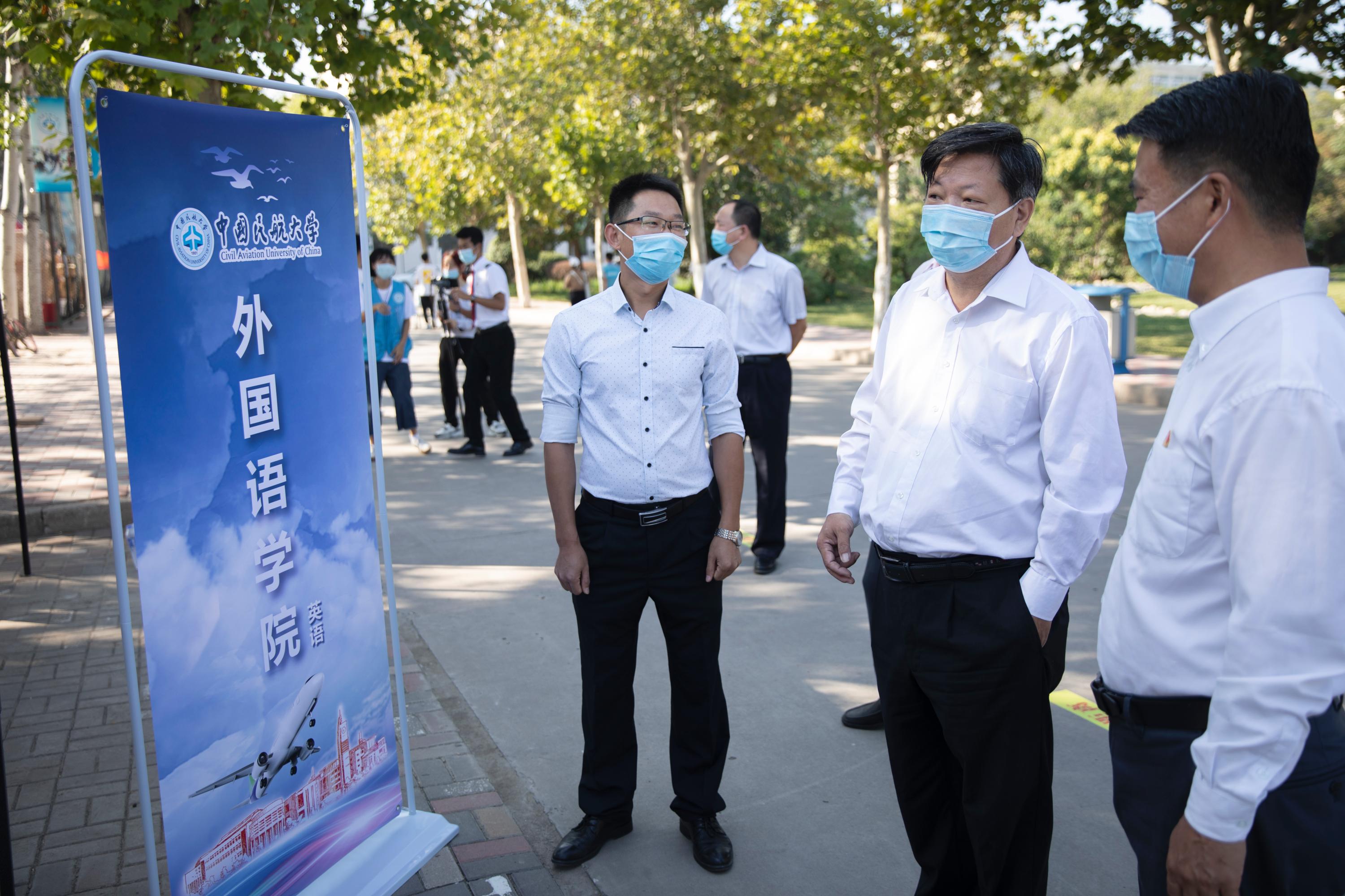 本网讯 9月19日,中国民航大学2020级本科新生集中入学的第一天。早上8:30,校长董健康、校党委副书记赵洪海来到南校区,检查指导新生入学情况。