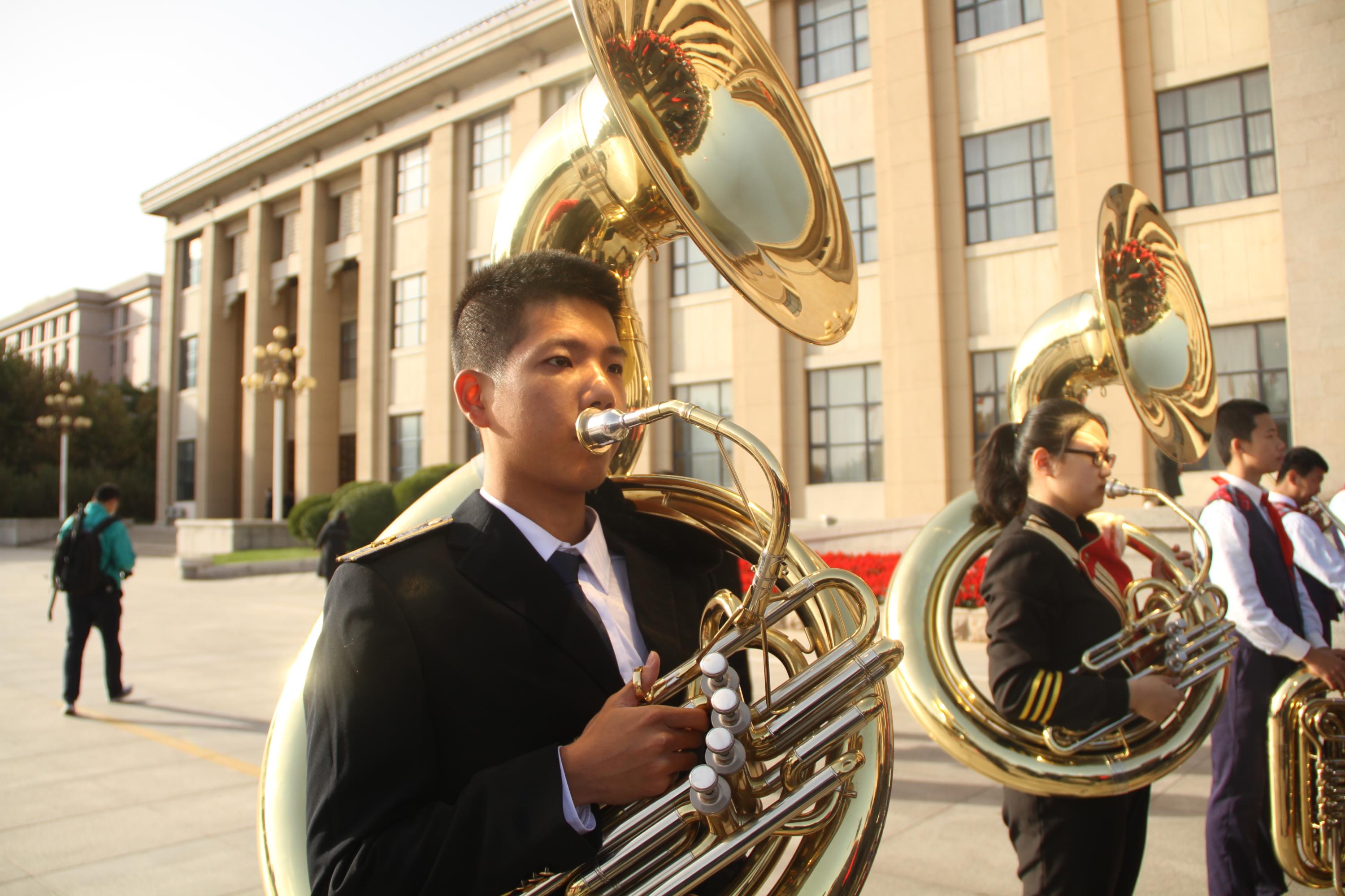 天津礼堂气氛庄严热烈,主席台上方居中高挂的中华人民共和国国徽熠熠生辉,10面鲜艳的红旗分列两侧。清晨6时20分,参加演出的学生在至善苑集合,乘坐大巴前往天津礼堂。经过几次临场彩排和队形排列后,全场学生管乐团演奏《歌唱祖国》《勇往直前进行曲》《中国少年先锋队鼓曲》,用雄壮激昂的音乐迎接在抗击新冠肺炎疫情中作出过突出贡献的英雄们。
