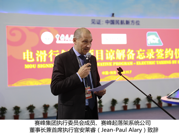 安莱睿首先对中航大对赛峰起落架系统公司一直以来的支持和信任表示感谢,并对电滑行系统的效益和重要性作出概述,电滑行系统的装载,可以使喷气式飞机在机坪上自主滑行,不需要依赖发动机和拖车,此项新技术将可以节约多达4%的燃油储备,同时大大降低噪音和环境污染。交通行业正在经历“绿色革命”,该项目体现了飞机供电的全球发展趋势。双方合作必将建成世界领先的研究和技术网络,同时也将大力推动中法航空业的联盟。