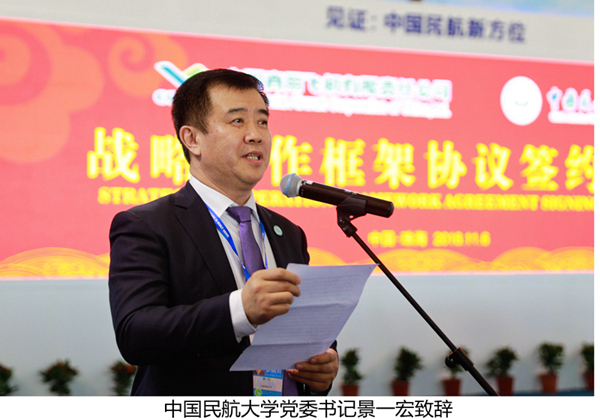 景一宏在致辞中指出,中国民航大学长期致力于国产飞机适航审定等方面的工作,为C919技术方案联合论证、安全性技术评估管理与文件体系、适航工程体系、供应商管理体系和客户服务技术体系以及适航人才培养等方面提供了重要支持。学校期待与中国商飞公司的合作项目进一步深入,合作领域进一步扩展,为国产大飞机和宽体客机翱翔蓝天做出新的更大贡献。此次与中国商飞公司续签战略合作协议,必将开启校企双方产学研全面合作的新纪元,进一步促进学校人才培养、科学研究、成果转化、国际合作等能力的提升。学校也将继续充分发挥科技、人才、信息和研究成果高度集中的优势,为增强中国商飞公司的自主创新能力和核心竞争力作出更大贡献。