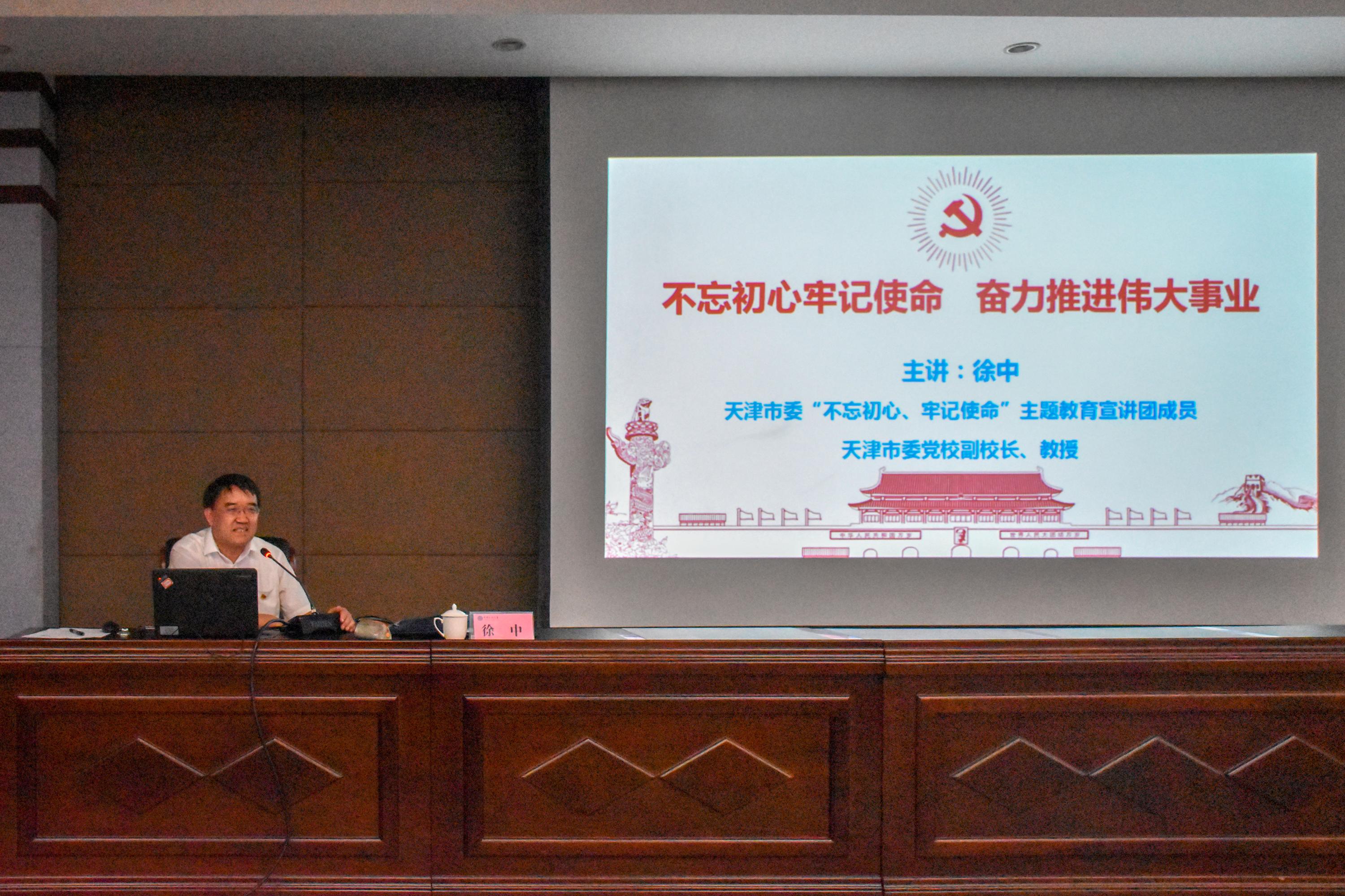 徐中以“不忘初心牢记使命·奋力推进伟大事业”为题,从“全面贯彻第二批主题教育的部署和要求”和“坚守初心勇担使命·奋力推进伟大事业”两个方面,系统详实、科学全面地诠释主题。讲座中,徐中传达中央“不忘初心、牢记使命”主题教育第一批总结暨第二批部署会议精神,系统介绍开展主题教育的重大意义、主题主线、总体要求、目标任务,深刻阐述第二批主题教育的四大特点,指出要深入学习贯彻习近平新时代中国特色社会主义思想,将“四个到位”贯穿主题教育全过程。通过分析历史事件和当前热点事件,他指出,初心和使命不是抽象的,而是具体的,是在一个接一个目标的接续奋斗中实现的,要把思想自觉,转化为行动自觉,把政治建设摆在首位,坚决做到“两个维护”。