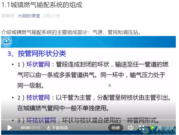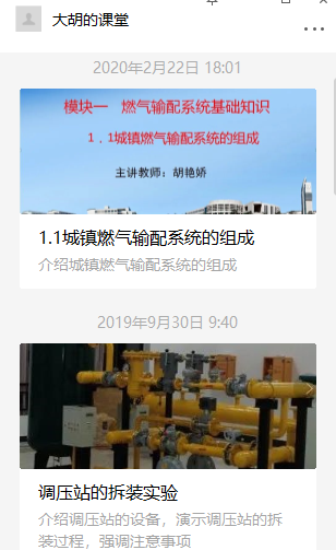 “大胡的课堂”是机场学院胡艳娇老师出于辅助教学、为学生提供学习资料的初衷所创建的一个公众号平台。在平台上有我们要学的《燃气输配》《输气管道》等课程的学习资料和视频课程。因为公众号有明确的分类界面,所以我们查找资料就非常方便,使用体验非常不错,平常会在这个平台进行自主学习。“大胡的课堂”是我们的备用之选,如果学习通等其他上课软件系统崩溃了,“大胡的课堂”可以保障我们的线上学习顺利完成。