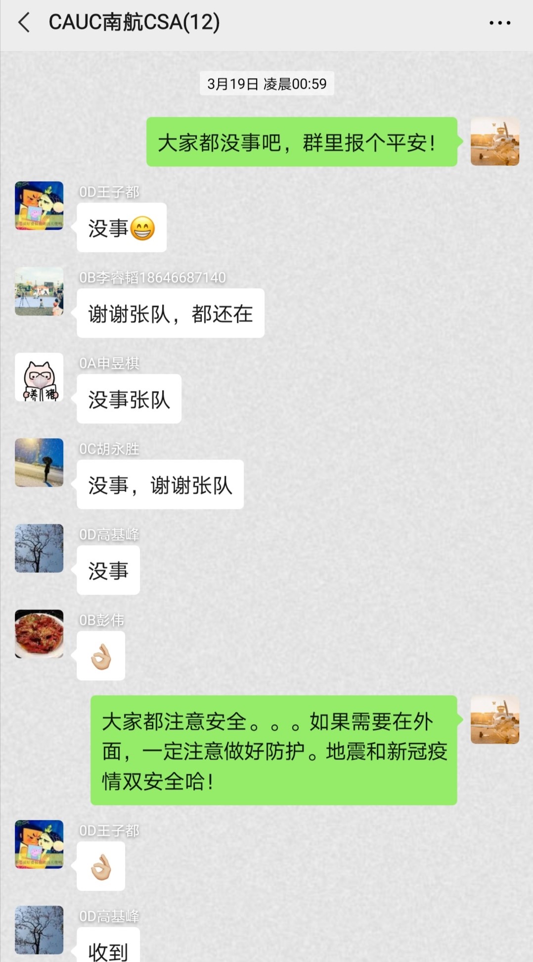 “队长,我们这里刚刚地震了”3月19日凌晨,飞行技术学院2016级辅导员张兆翔被一个来自大洋彼岸的微信语音电话惊醒,2016级CSA航校领队报告航校所在地区盐湖城发生5.7级地震。来不及多想,他立刻在航校学员微信群里询问每名学生情况,当全部学生回复确认安全,悬在半空的心才稍微平静。随后顾不得休息,履行好特殊情况报备流程后,又进一步通过网络了解地震情况和当地受灾情况,当确认余震逐渐减弱,航校房屋、用电和通讯均未受到影响时,已经过了凌晨2:00。