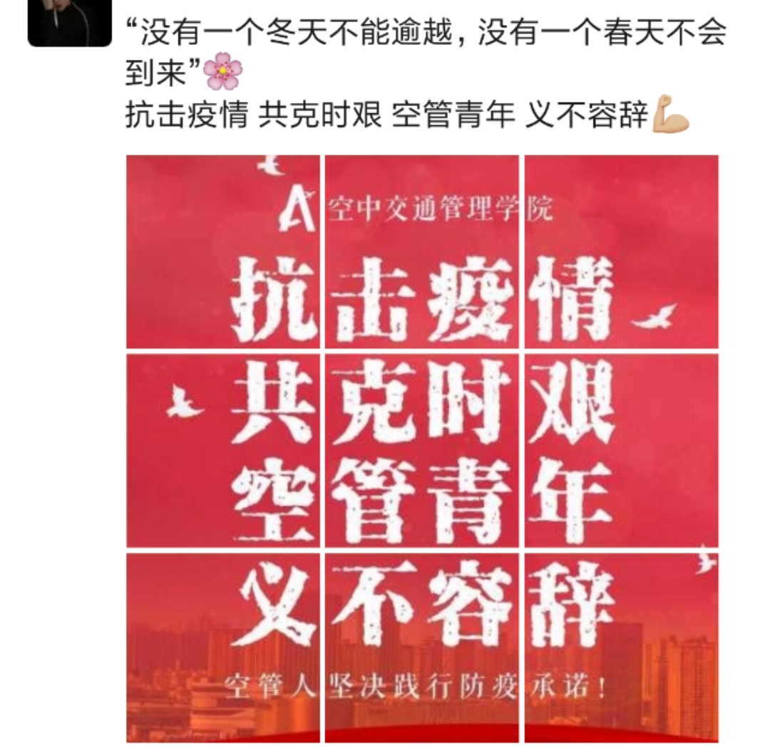 空管学院团委制作了“抗击疫情·共克时艰·空管青年·义不容辞”的壁纸,致敬最美逆行者和每一位为疫情防控阻击战作出贡献的人,号召同学们少出门,不聚会不信谣不传谣。2018级团总支向广大团员发出“坚定制度自信,打赢防控疫情阻击战”的号召,坚定制度自信,不信谣。不传谣,积极参与防疫舆情引领工作。