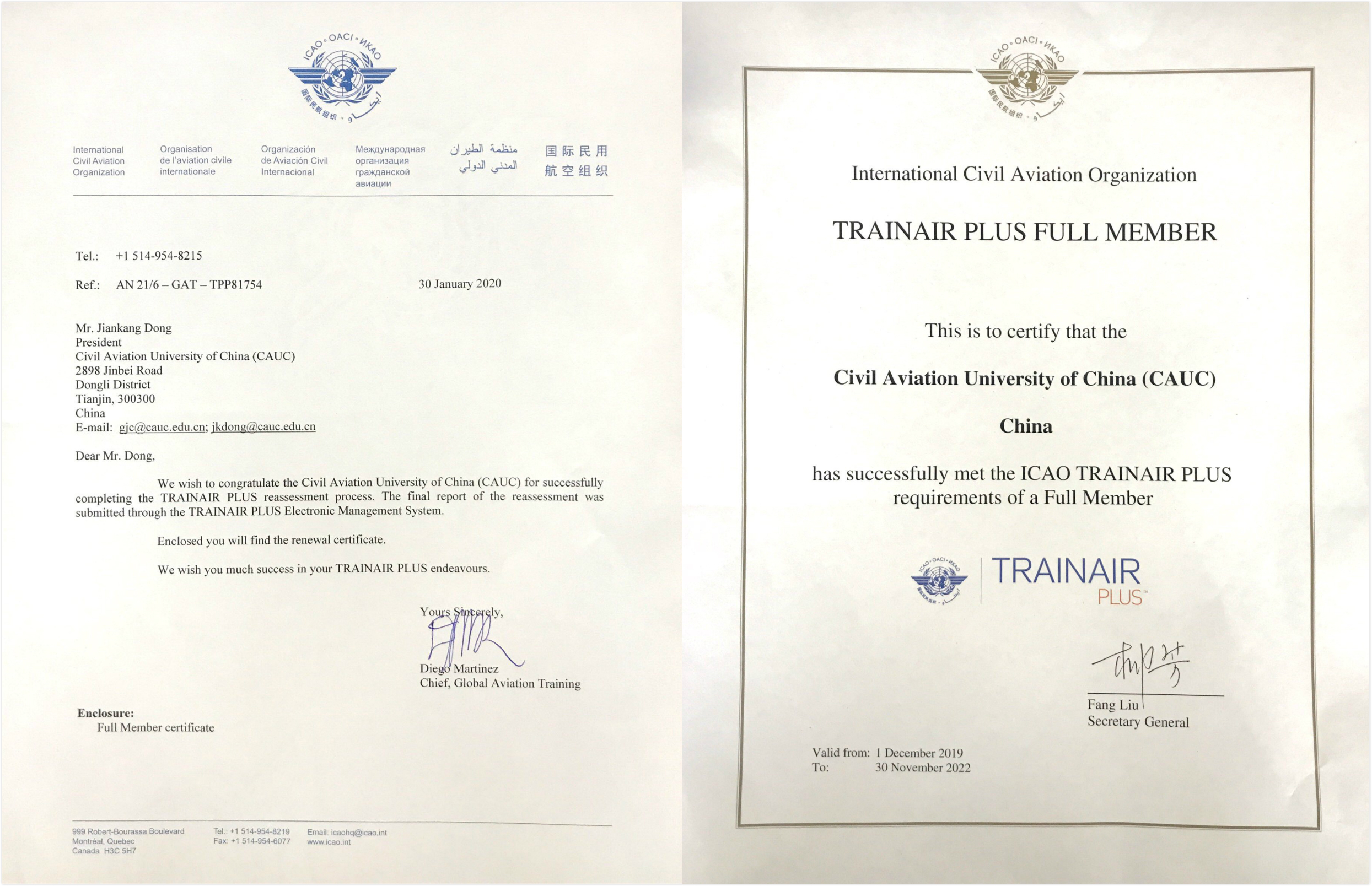 中航大获得ICAO TRAINAIR PLUS正式成员资格证书