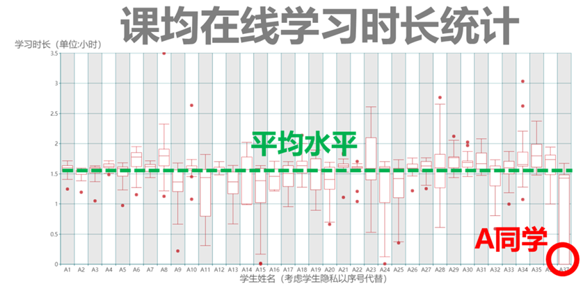 李岳深入挖掘在线教学数据,编制了“精确到人”的课均在线学习时长统计表。及时发现学业困难学生A同学,了解到他因为挂科重修而与本课程发生上课时间冲突的实际困难,造成A同学有效在线学时低于班级平均水平。