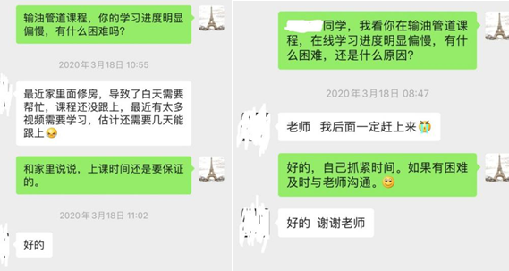 《输油管道设计与管理》课程组在线上教学日报中充分利用在线教学平台的过程评价优势,提取前期教学数据,围绕平台提供教学资源任务点完成情况、前期作业测试成绩、学生参与课堂互动得分,以及平台给出的学生加权综合成绩等方面,对所有学生的学习情况做了系统梳理,确定了部分前期在线学习效果不佳的学生,单独发布了“教学预警通知”;对学习进度快、效果好的同学,在课程平台中进行了通报表扬。
