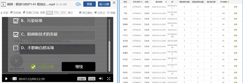 充分利用钉钉群在线授课的“回放”功能,让学生在时间冲突时先去上重修课,晚上再安排时间观看白天课程的视频回放,保证当天学业当天完成,绝不落下每一节课。李岳则通过后台数据监督学生当天学习时长是否达标,并根据“课堂派”平台在线测试成绩,检查学生对所学内容是否完全掌握,利用业余时间给予线上指导。
