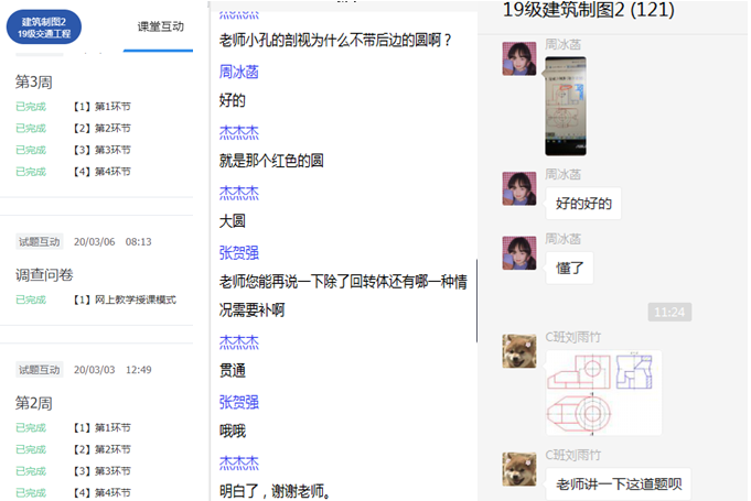 彭晶在课堂派平台构建了《建筑制图》网上课堂,第三阶段选课的学生也陆续加入网上课堂。网络授课采用“课堂派+微信群+腾讯会议”开展多模式混合式教学。学生根据预习公告提前自学预习平台的相关资源, 授课过程采用慕课视频、教师讲解、学生提问、师生讨论、互动答题等多种模式展开。《建筑制图》网上课堂每节课通过GPS定位进行签到,通过“课堂互动”模块发布每节课所需课件,彭晶都会根据课程内容设置互动题目与学生互动交流,了解学生对知识点的掌握情况、学习过程存在的问题,对学生的不同问题给出针对性建议。