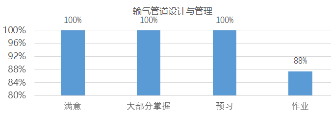 根据近一个月的线上授课日报及学生调查问卷数据显示,《输气管道设计与管理》课堂签到率很高,超星平台流畅,线上教学几乎无卡顿,学生对教师教学组织满意度很高,对课堂知识的掌握度近乎100%。