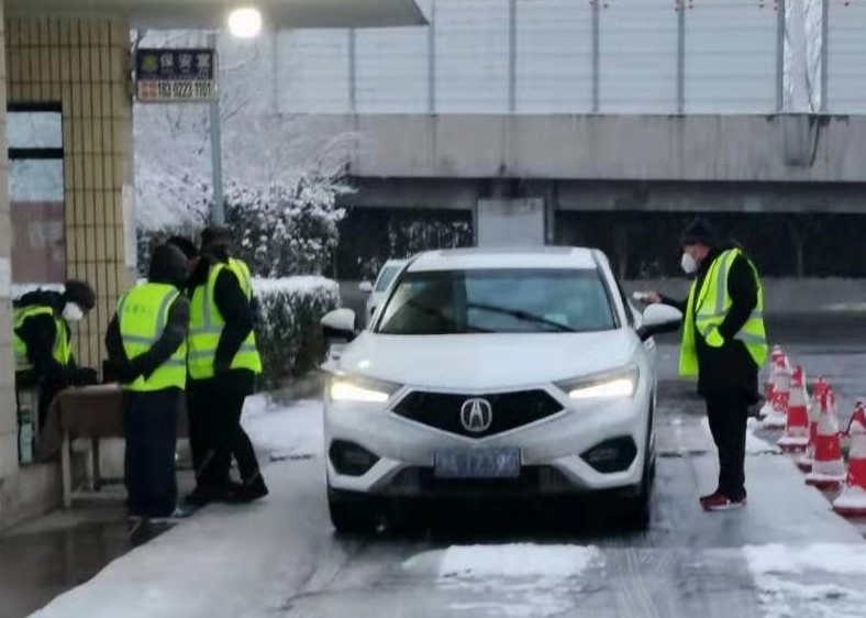 校园管理服务中心的员工雪中进行车辆登记和测温工作