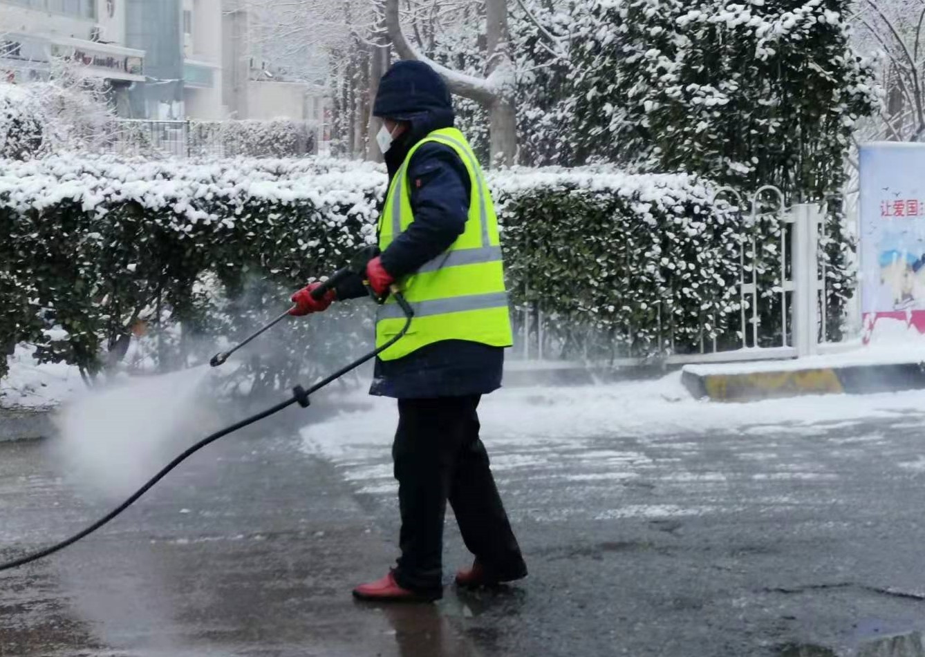 校园管理服务中心的员工在雪后喷洒消毒液