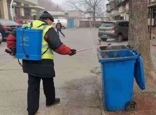校园管理服务中心工作人员对家属院的垃圾箱进行消毒杀菌