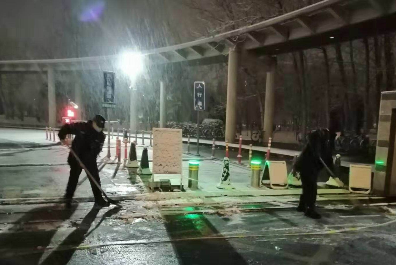 2月14日,津城迎来抗疫以来的第二场大雪,中国民航大学保卫人员和后勤公司校园管理服务中心职工冒雪坚守岗位,守护师生生命健康安全。