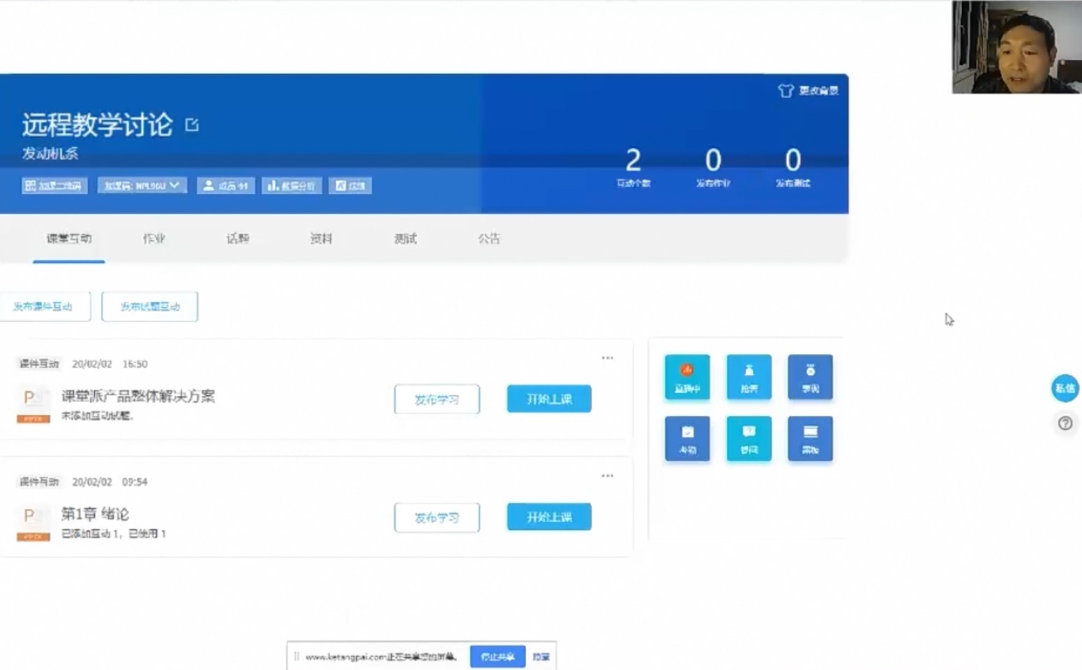 学校发布“停课不停学,做好网络教学准备”的通知后,发动机系专业负责人李书明当天组织各课程组负责人研讨网络教学方案。李书明根据已有的“线上+线下”教学经验,分析网络教学在“课程设计、讲授方式、互动模式”等方面与课堂教学的异同。2月2日晚上20:00,发动机系再次召开线上研讨会,李书明以在线直播教学的方式为全系教师讲解网络教学的运用方式和注意事项。