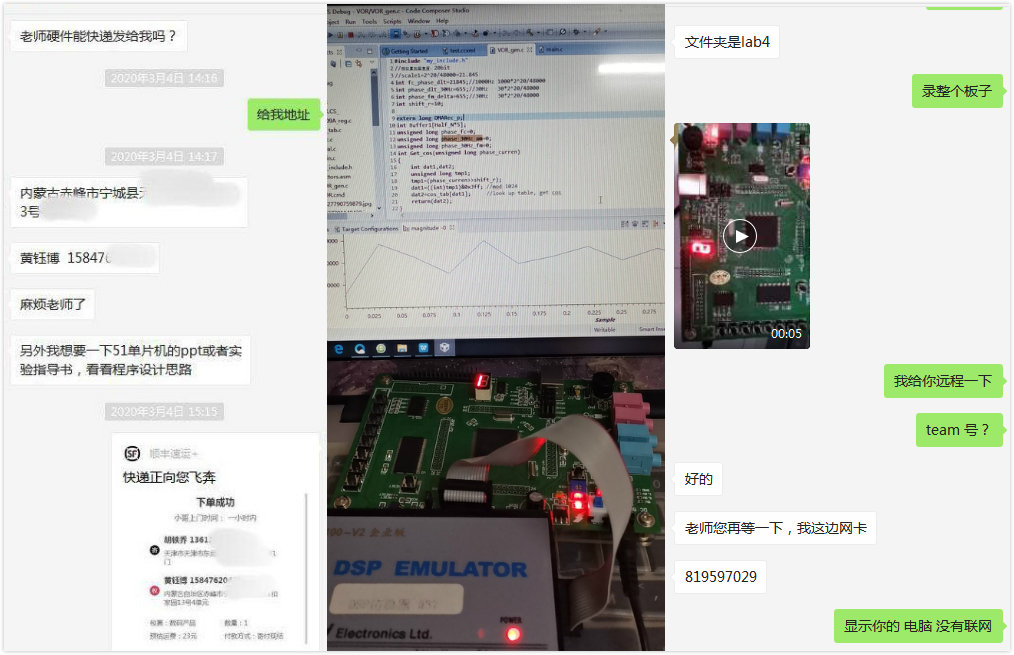 疫情期间,每一位指导教师对学生毕业设计(论文)的指导都比往年倾注了更多心血。通信工程专业教师胡铁乔,他指导的学生毕业设计有部分硬件内容,他将硬件板快递给学生,指导学生通过team远程操作,结合微信音频,远程指导学生使用CCS软件。