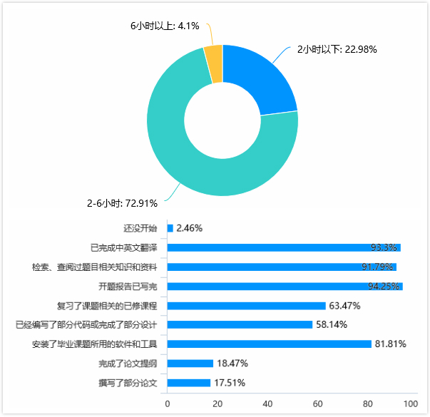 强化沟通,服务学生,统筹部署。在毕业设计中期检查期间,学院面向全体毕业生开展关于毕业设计的问卷调查,全面了解学生现阶段毕业设计进度和面临的实际困难,及时与各专业相关指导教师沟通反馈。调查中发现,约有80%的毕业生每天用于毕业设计研究的时间在2小时以上,近90%的学生反馈毕业设计指导教师的指导非常到位或比较到位。同时,学生反映,虽然疫情影响了返校的脚步,但线上与指导教师的沟通都比较顺畅,能够较好完成毕业设计任务。学院将根据学生及指导教师的反馈统筹部署毕业设计后期相关工作。