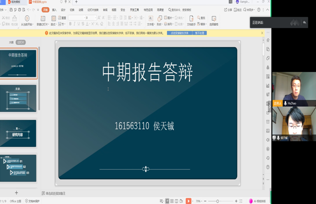 线上战“疫”,掌控进度,保证质量。学院根据2020届本科毕业设计工作安排要求,掌控本届毕业设计(论文)各环节时间节点和工作内容。从任务书下发、开题报告、外文翻译、中期报告等各个环节监控全体学生的进度情况,及时督促,不因疫情延误毕业设计工作,真正做到“停课不停教,毕设不停步”。学院教学督导组按比例抽查各专业学生参加视频中期答辩会情况,了解学生在疫情期间真实的毕业设计进度和水平,为下一步推进毕业设计进度,保证毕业设计质量打下基础。