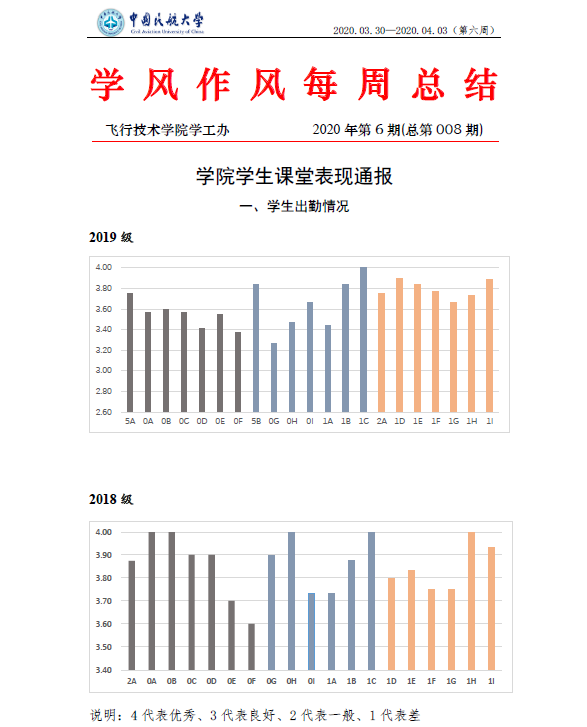 自2月24日以来,学习发展中心收集学风作风每日要情共46篇,每日情况由当天值班辅导员制作发布;学风作风要情周总结共9周18篇,由大数据中心汇总制作,分别从“平均分”与“优秀率”两个角度全面分析网课期间的学生状态,在每周一的学工办例会上进行分析,然后通过中队会、班委会传达给各班班委及学生。