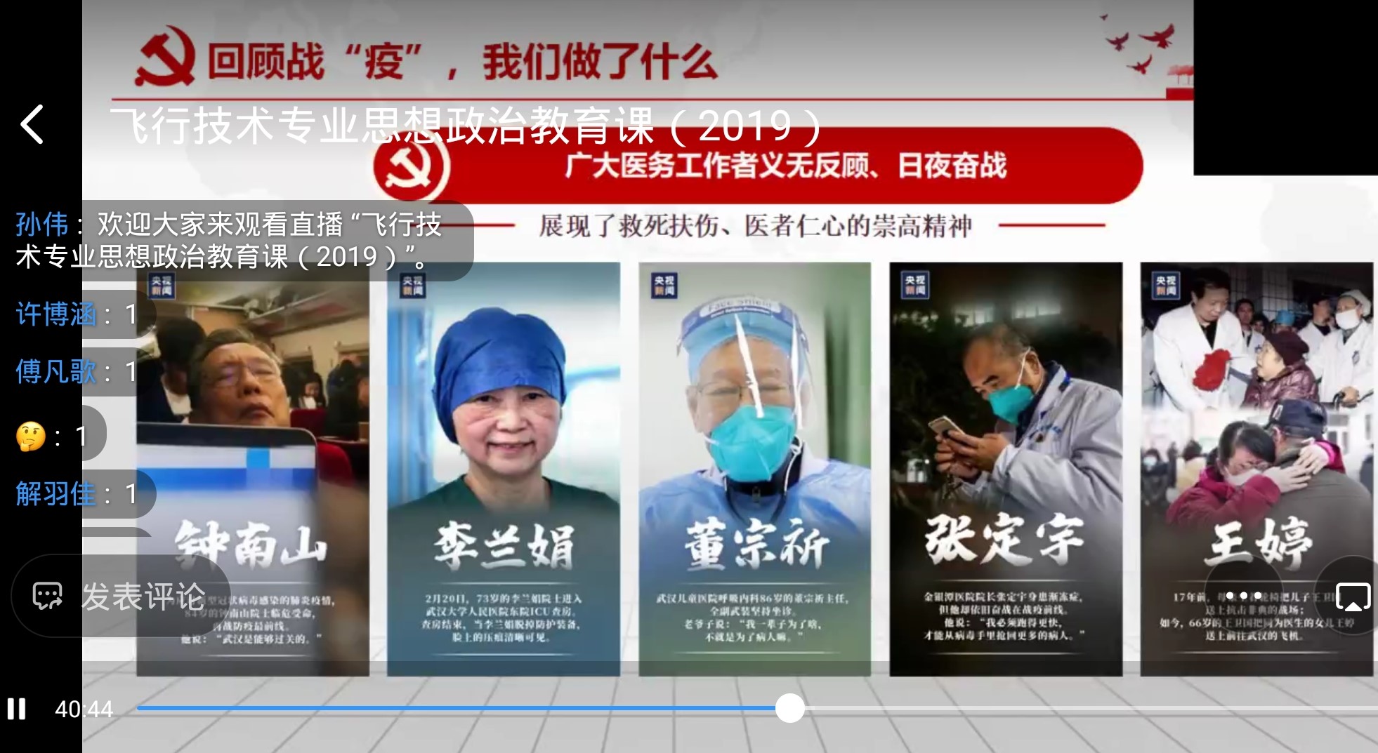 飞行技术学院一直将培养出“政治强、本领高、作风硬”的学生作为教学目标,在疫情期间,加强课程思政,因事而化,因势而新,“飞行学生走到哪儿,思政教育跟到哪儿”。