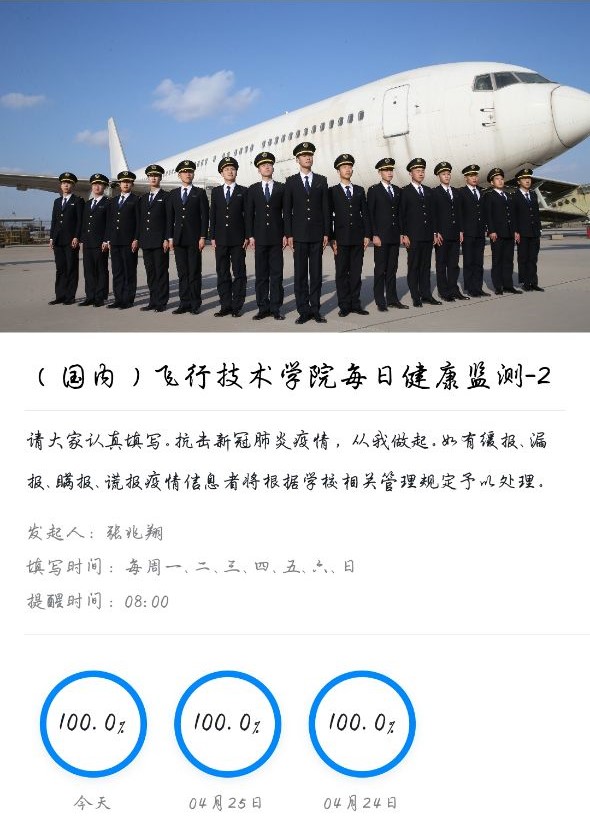 对于学生们的身体健康状况问题,飞行技术学院同样利用钉钉平台严格监控。学生每天按时上报自己所在位置、身体状况和接下来三天内的出行计划,由班级学生骨干进行统计和上报。学院可随时掌握学生动态,把疫情风险做到可知、预知。