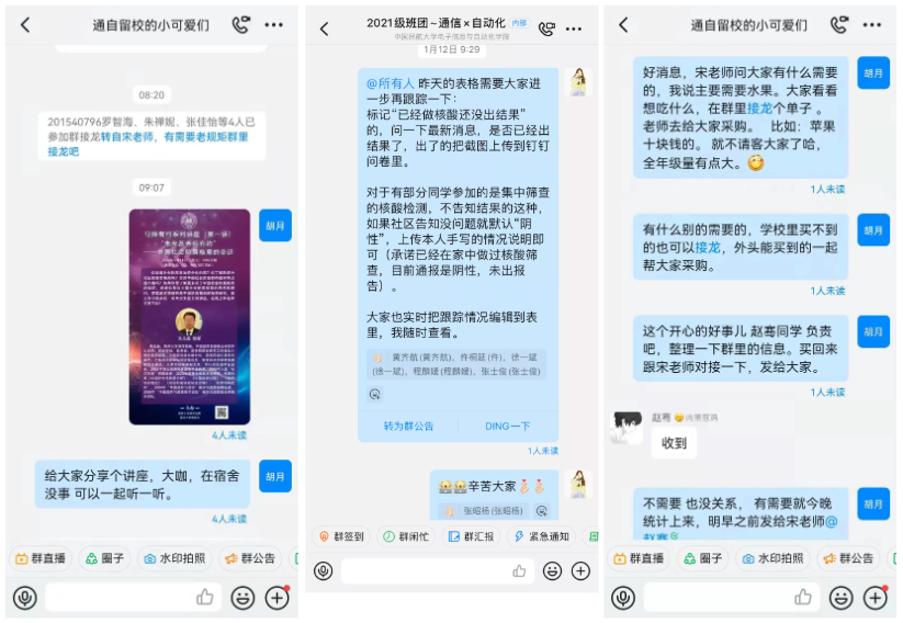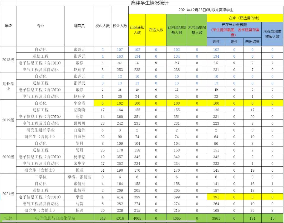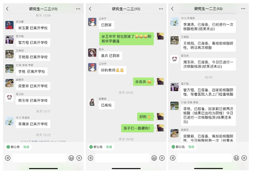 学院各年级为各类学生单独建群,加强联络与沟通,建立班委、辅导员、班导师三重联络工作体系,学院领导、老师在线与学生沟通交流,关心关爱学生的身体状况和心理状况。在12月23日0时离津学生信息统计、未做核酸检测学生统计、核酸检测结果收取、流调等工作中实施“销号管理”,落实一个,消除一个。学院党委带领全体学工干部深度思考疫情期间学生工作的分类指导工作内容和要求,要求学工干部要了解不同年级学生的需求和急需关注和解决的问题,切实做到分类指导施策。