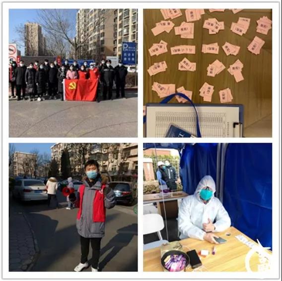 教师党员任景瑞、鲍倩瑜、学生党员孙博阳、张涵予在社区担任志愿者