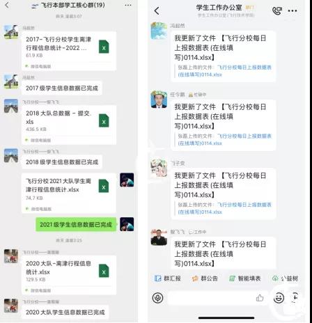 疫情就是命令,防控就是责任,管控就是义务。在飞行分校党委的正确领导下,学工团队闻一知十,快速反应,第一时间布置建立全体离津学生群、隔离学生群、防范管控封控学生群、健康码异常学生群、离校在津学生群,安排部署各群专人专管专盯,实现重点学生情况动态更新。结合近期分布全国14个省份航校学员离校返乡情况,实时部署更新每日钉钉健康问卷,配合疫情防控各项数据统计。做到全体学生离校返乡五个“一”:告知学生离校返乡第一选择“点对点”直达方式,避免换乘风险、尽量离校第一时间报备辅导员行程信息、到家第一时间报备社区个人情况、服从属地安排第一时间进行核酸检测、出来核酸结果第一时间报告当地社区及辅导员。
