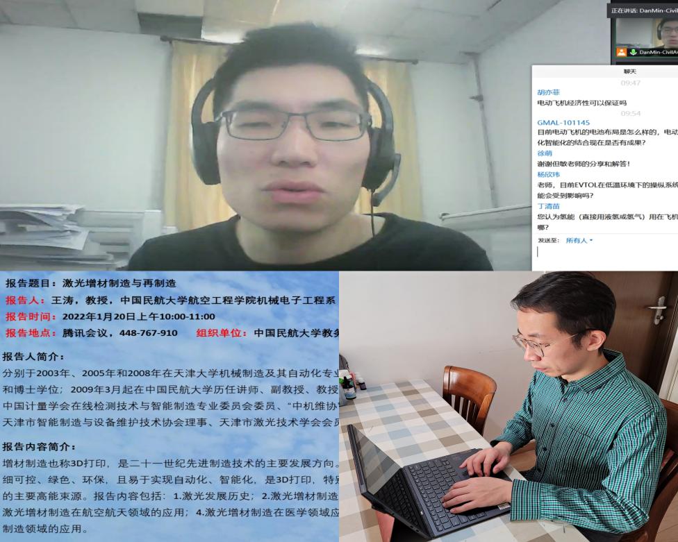 1月20日,航空工程学院首日线上讲座拉开序幕。但敏从国内外电动航空的发展现状开始,对国内外典型进行剖析,详细阐述未来推进系统中的储能、电动等关键技术。王涛以“激光增材制造与再制造”为主题,通过观看生动有趣的激光、拉伸小视频等方式,科学地讲解激光增材技术的发展、工作原理等内容。讲座吸引众多学生、教师在线观看学习,学生们积极参与提问互动。在校生郝运表示:“一月,一个到处充满新年气息的月份,疫情的出现让我们乱了阵脚,好在我们没有慌乱,学校在保证我们正常生活的同时,提供线上学习资源,让我们有选择地听我们喜欢的讲座,学习知识,丰富了我们的寒假生活。”