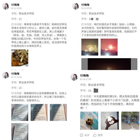 职业技术学院学生付梅梅认为这次活动非常有意义:“尤其是对我在居家隔离来说,以打卡的方式记录隔离日常,放松了心情,看着打卡记录,感觉自己每天都是有意义的!而且通过打卡活动每期推出的作品,看到其他同学的日常,不经意间与外界多了一份联系。知道每个人都在认真生活,记录快乐,自己也会多一份幸福感,让无聊的隔离生活丰富起来。”