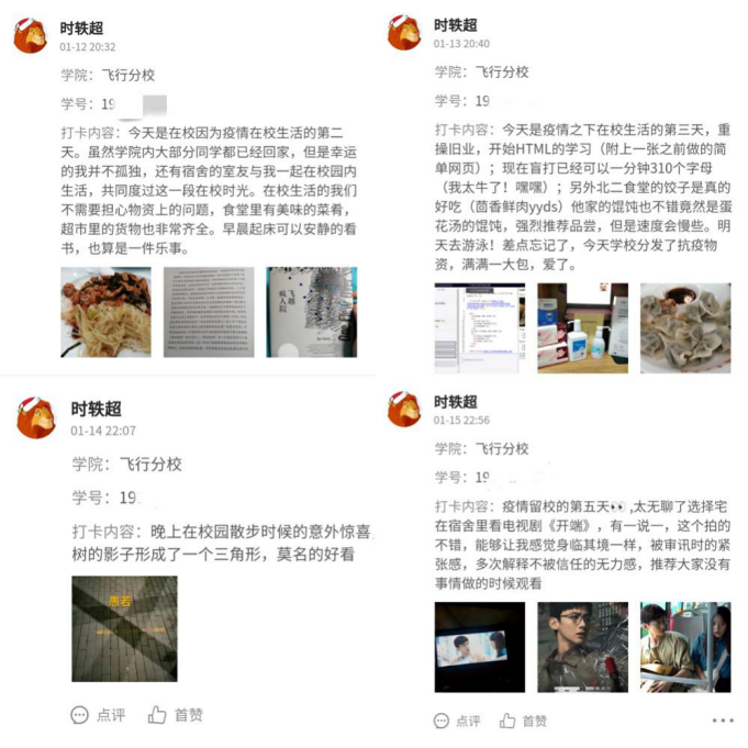 飞行分校学生时轶超认为这次活动就像是一个分享的平台:“分享自己每天的见闻,使我们这些被隔离在校和那些集中隔离或者居家隔离的同学们放松一下压抑的心情,看到每天在微信公众号上推送的优秀作品,可以体会到他们一天的生活和快乐。欣赏不同地方的景色,体会不同的美食。另外本次活动也会让参与者们有一种分享欲,去发现校园或隔离点附近的景色,去分享日常的小事。对于我个人来说,尤其是那个校园夜晚由树影组成的一个三角形,是我在学校这两年半的时光中未曾发现的。”