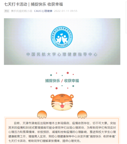 本网讯 1月8日,天津市津南区突发新冠肺炎疫情,中航大学生积极配合防疫工作要求留校,也有许多返乡学生按照当地防疫政策进行隔离。为缓解学生的负性情绪感受,增强积极心理体验,大学生心理健康指导中心于1月12日至18日举办“捕捉快乐 收获幸福”七天打卡活动。
