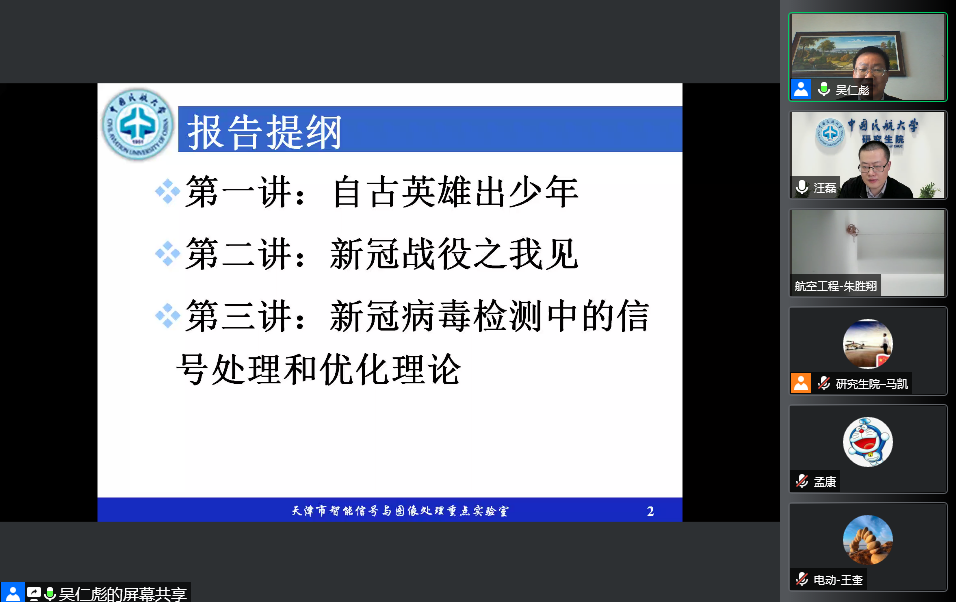 开展“研究生院高端学术讲坛”,提升学校研究生学术能力和水平,全面提升研究生培养质量,首期讲坛邀请吴仁彪主讲。吴仁彪从“自古英雄出少年”“新冠战役之我见”“新冠病毒检测中的信号处理和优化理论”三个方面,深入浅出、旁征博引地向参会师生介绍“神奇的28现象”“新冠病毒医学检测方法”及“核酸分组筛查概率原理及优化方案”,并分享“抗疫体会”及“十条人生感悟”,参会师生受益匪浅。