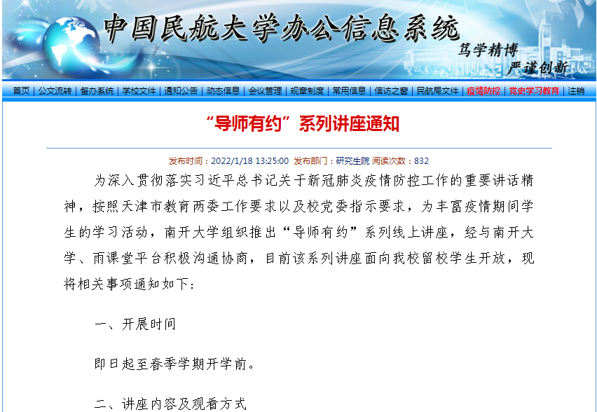实现高校“导师有约”系列资源共享,促进研究生德智体美劳全面发展。为进一步丰富疫情期间学生的科研学习活动,研究生院与南开大学、雨课堂平台积极沟通,实现“导师有约”系列线上讲座资源共享。讲座主题涵盖学术研究、职业发展、社会实践等多个方面,帮助研究生收获人生智慧和成长路上的“羊皮书”。