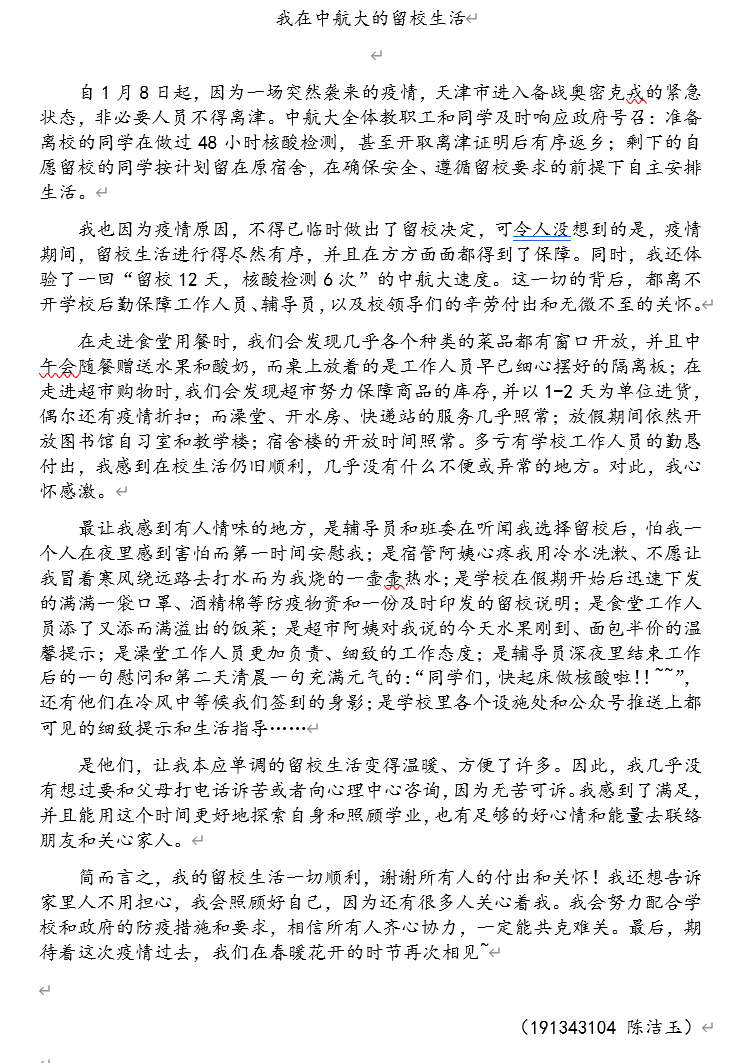 在抗疫期间,有过恐慌,有过感动,“写下一封书信”主题活动为同学们提供了展现所见所闻,抒发所思所想的平台。不管身处何处,亲人朋友的惦念与牵挂、对美好生活的期盼与期望都是每个人勇敢前行、战胜困难的不懈动力。来自莘莘学子们的上百封优秀书信感人肺腑,将自己对亲人朋友的思念、对集中隔离的同学的关切、对医务工作者的感谢凝聚在字里行间。安全科学与工程学院191343A班的陈洁玉留校过年,但让她欣喜的是,留校生活并不单调孤独,而是井然有序,方方面面都得到了保障。她用文字记录下自己丰富多彩的留校生活,表达了对学校后勤保障人员、辅导员及班委的感谢,也将自己的学习生活状况报给亲人,让亲人放心、安心。