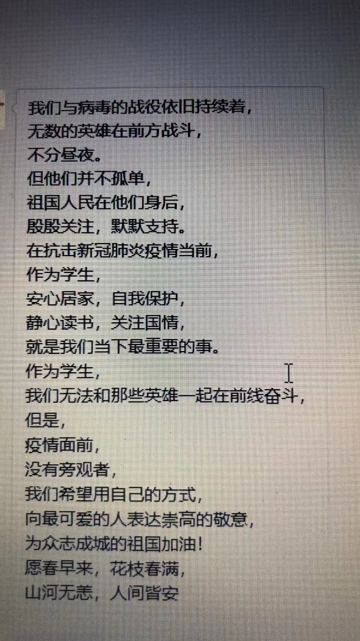 在“送上一段祝福”主题活动中,学生们以文字、视频等多种方式为冲锋在前,参与抗疫工作的青年志愿者和配合各地防疫政策集中、居家隔离的同窗们隔空送祝福,传递思念、传递正能量,相互激励,共同成长,为共克时艰、战胜疫情加油打气。