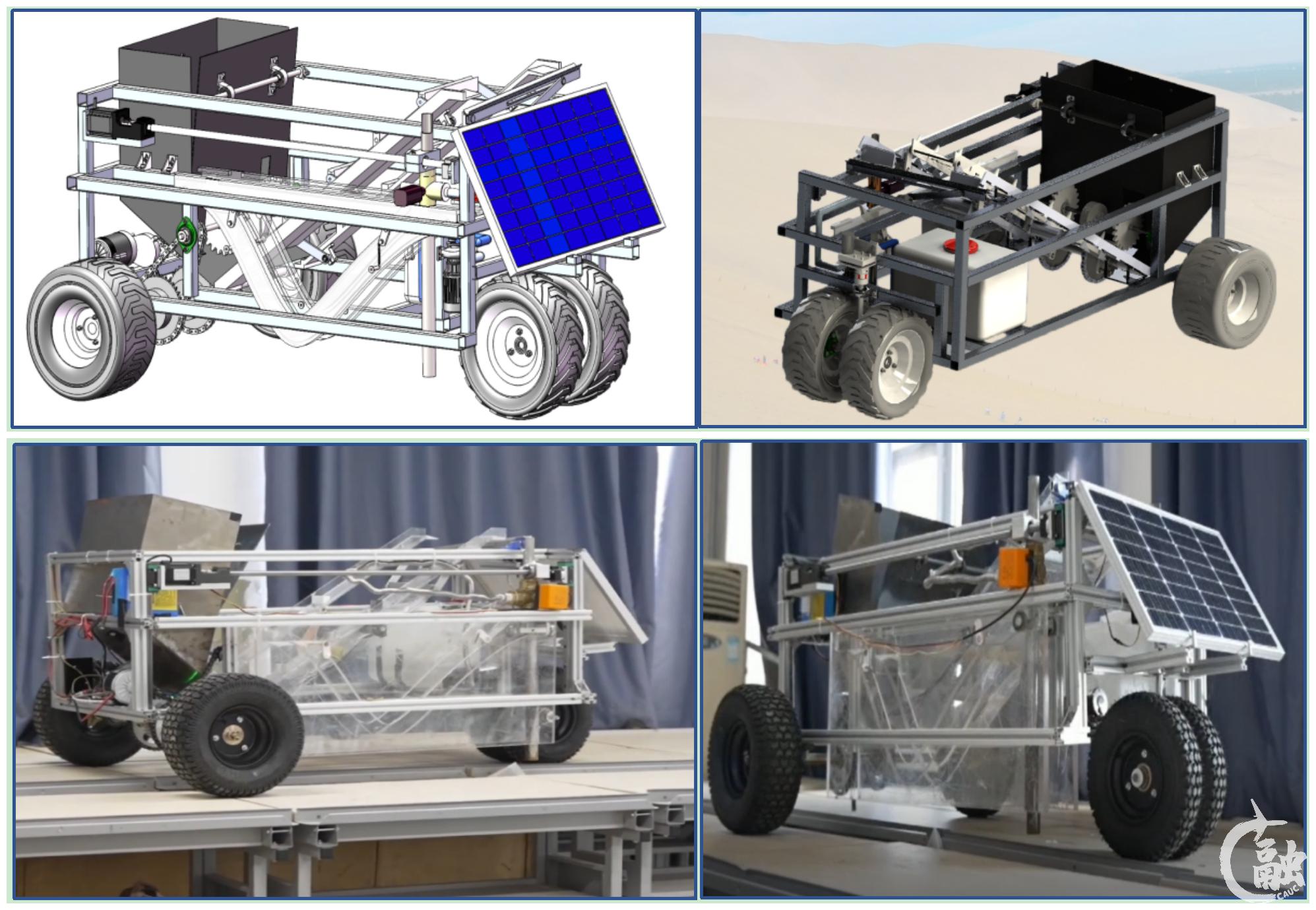 由钱俊泽和何振鹏等教师组成的教师团队指导的《“随耕大漠“智能一体化植树车》项目基于新时代“人与自然生命共同体”的绿色发展观,并结合目前生态修复中热点方向——防风固沙相关问题加以思考、探索和创新,解决沙柳种植人工效率低、树种成活率低等痛点问题,打造集分、送、立、植四位一体化智能植树车。产品使用双棘轮和凸轮-摇杆机构、复杂连杆机构以及参数化轨道等巧妙的机械结构,开创集灌溉、种植一体化智能沙漠植树车新发展方向。边走边植的“不停歇”种植模式使得该产品相较于同类产品具有独特性。该产品将服务于中国荒漠地区的沙柳种植工作,打造智能化的高效产业模式,促进传统沙柳种植产业的转型,形成以该类产品为核心的新型沙柳种植体系。