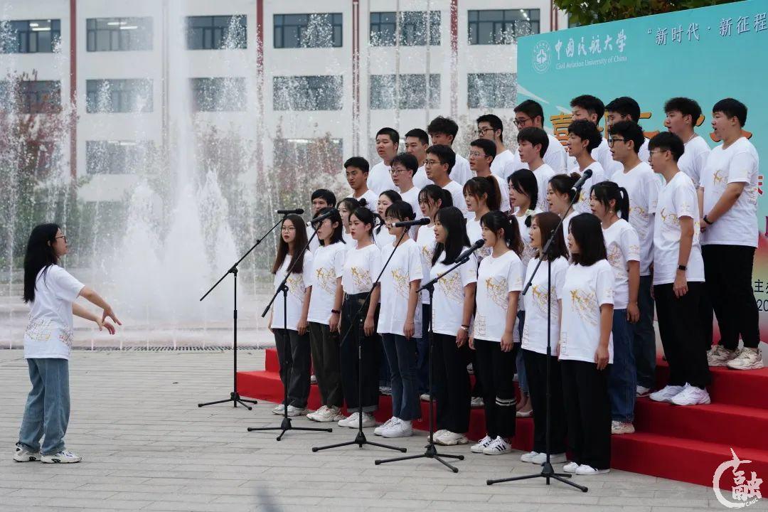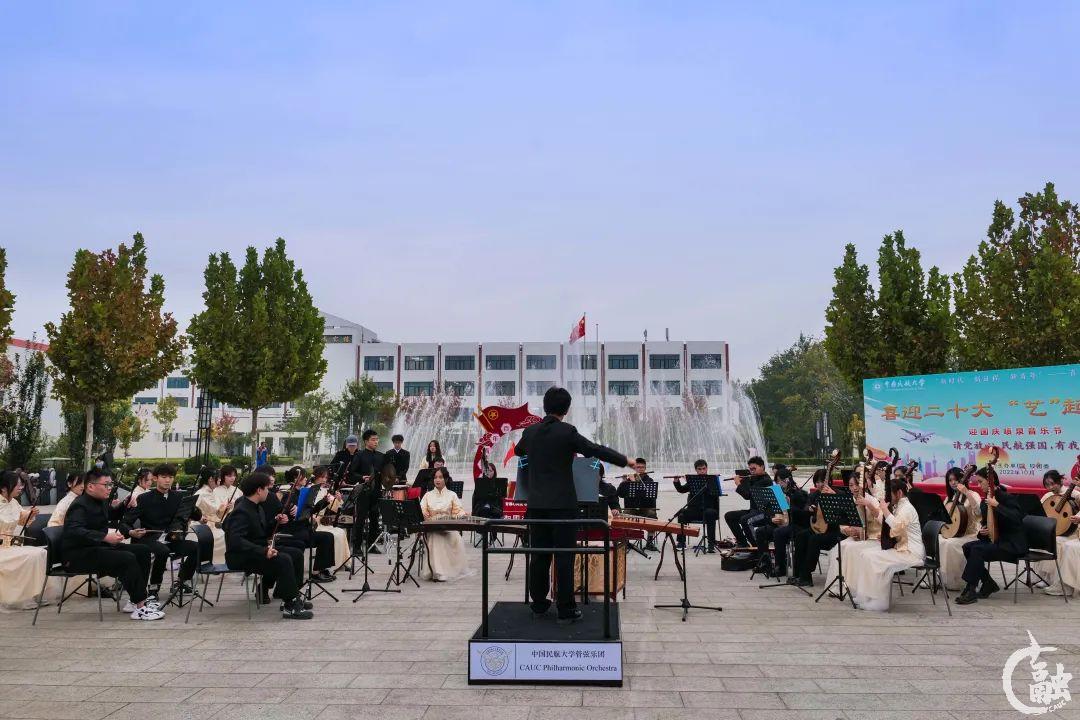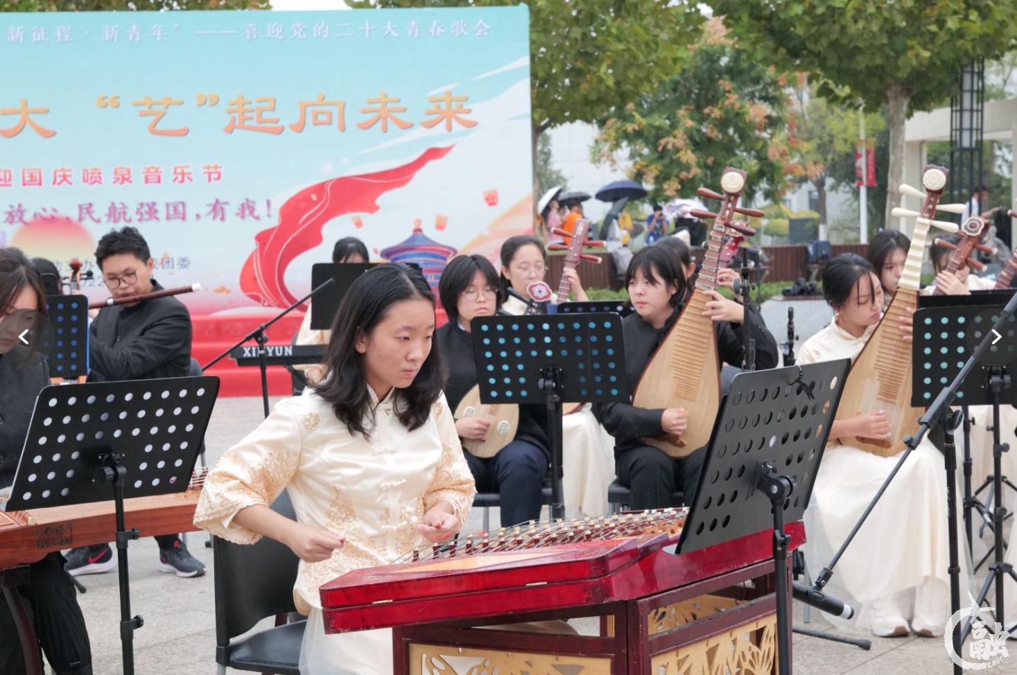 本网讯 伴着轻抚脸颊的微风和丝丝凉爽的细雨,喷泉广场上的灯光交相辉映,一场露天的音乐盛宴正如约上演。10月1日,“喜迎二十大,‘艺’起向未来”迎国庆喷泉音乐会在中国民航大学东丽校区北区音乐喷泉广场举办。