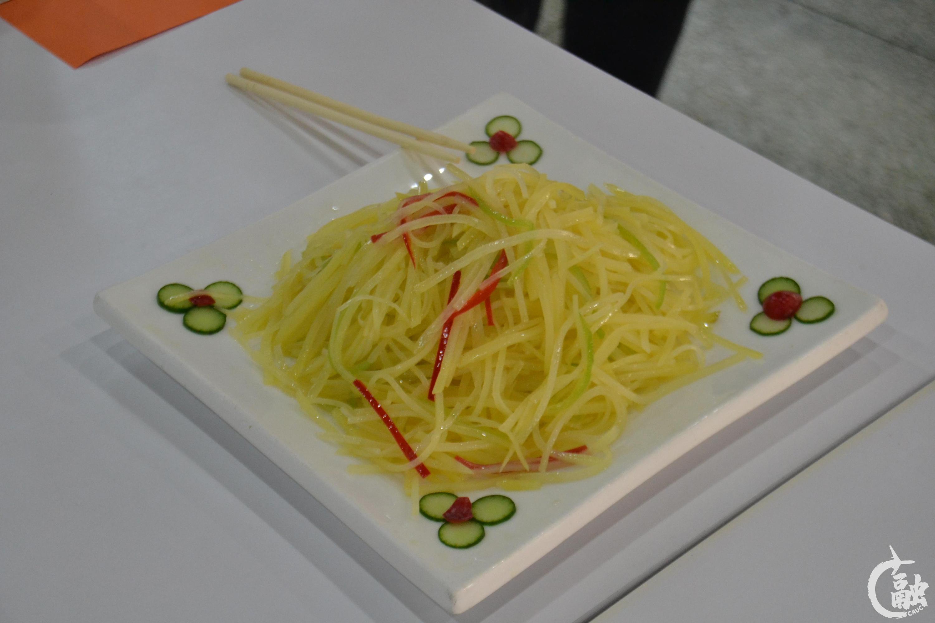 比赛分为团队展示和厨艺比拼两个环节。各具特色的团队展示引燃全场的气氛,自信的口号、整齐的队形无不彰显着选手们必胜的决心。厨艺比拼环节包括规定菜和特色菜的比拼,选手们纷纷穿戴好厨师衣帽,在后厨忙得不亦乐乎,准备大显身手。规定菜比拼——清炒土豆丝。厨师们各个刀工精湛,简单的菜品通过对味道的恰当把握,赢得学生们的掌声。自由菜比拼环节,在规定时间内,各个小组都捧出精心制作的菜肴:菜心烩芋头丸、酸汤肥牛、“鲤跃龙门”“游龙戏凤”……色香味俱全,无论是外观还是味道,现场评委和学生都赞叹不止。整个现场气氛浓厚,已然成为了一场“美食嘉年华”。评委们根据菜品色感、形感、味感、质感等方面对参赛作品进行综合打分。
