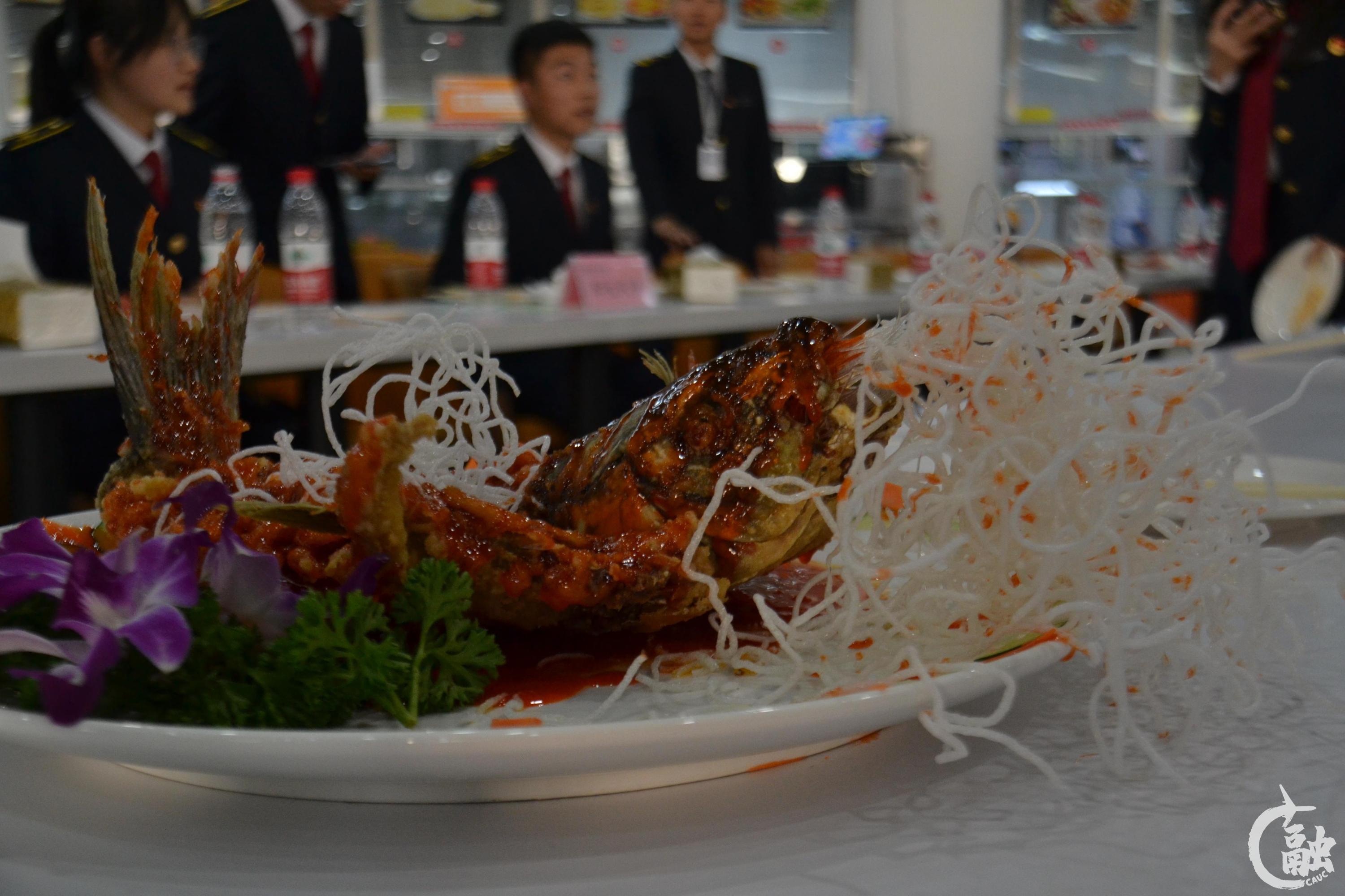 冠军队伍的厨师代表赵辉已有十余年的烹饪经验。在最终环节,赵辉选择制作“鲤跃龙门”。赵辉烹饪手法娴熟,技巧精湛,整条鲤鱼栩栩如生,口感外酥里嫩。“选择烹饪这道菜的原因很简单,‘鲤跃龙门’,我对中航大学子的美好祝愿都浓缩在了这道菜中。”