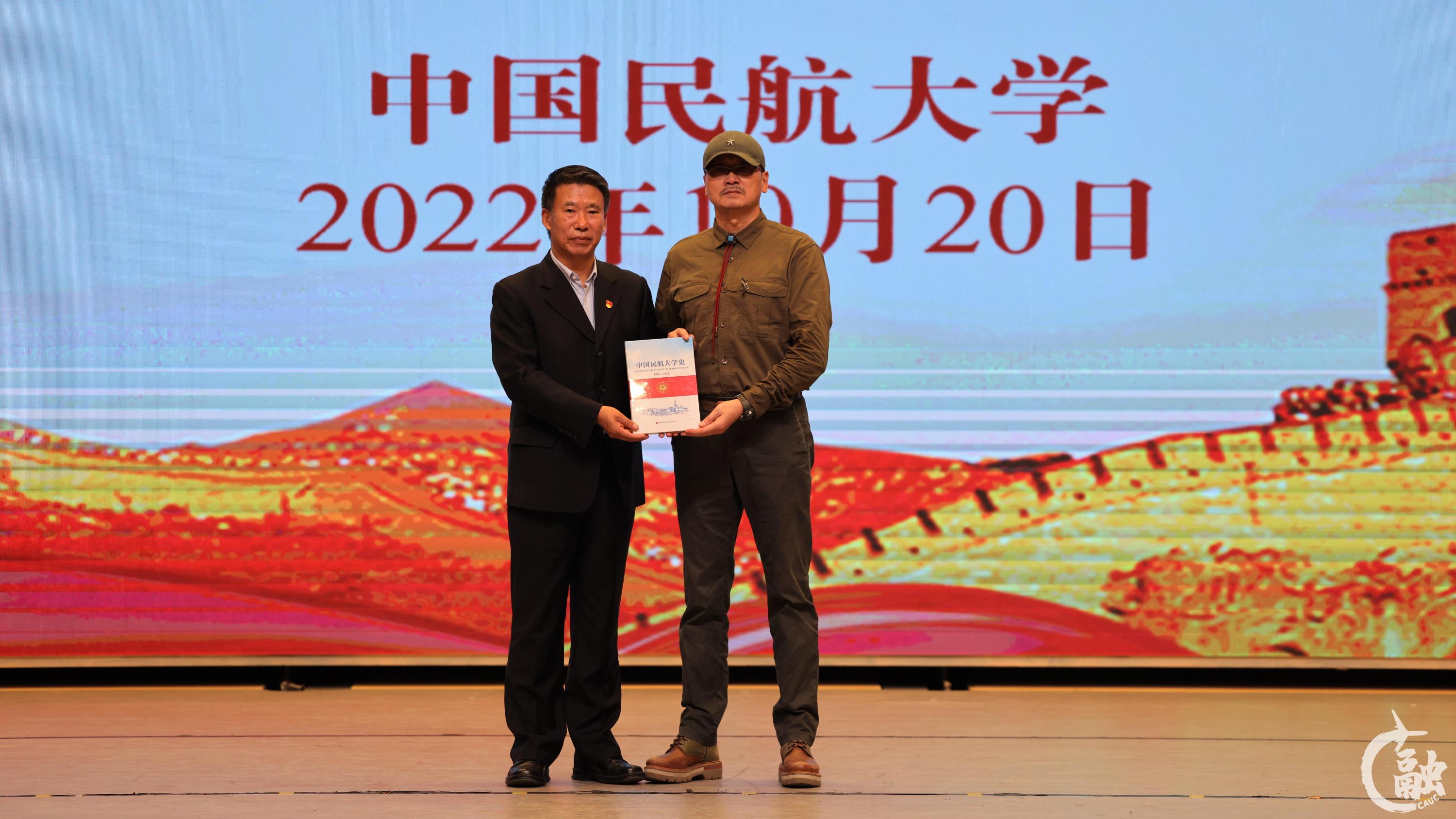 左力向中航大师生赠送图书《一个人的长征》,希望大家通过更全面的方式感受长征精神。赵洪海代表师生接受赠书,并将《中国民航大学史》赠与左力,指出这本校史承载记录了一代又一代中航大人在不同历史时期与新中国民航休戚与共的奋斗故事。