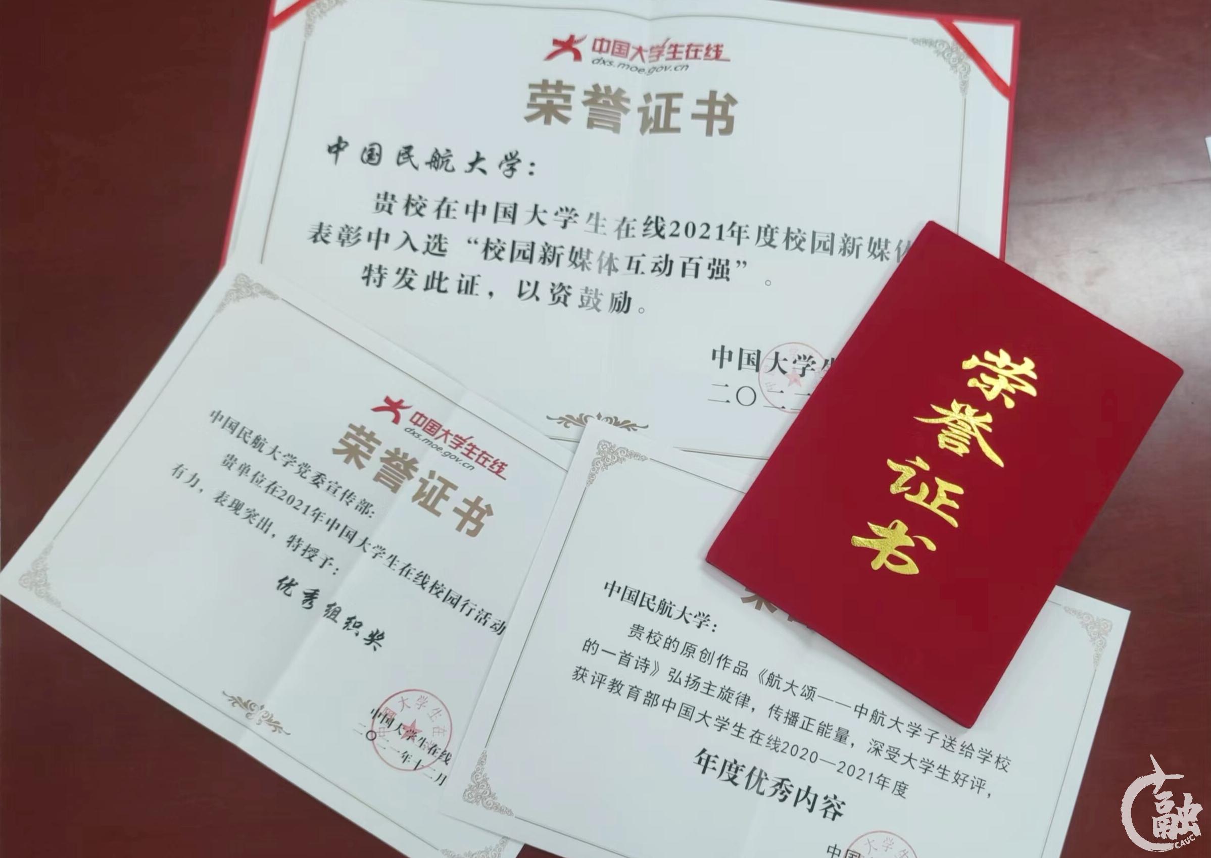 本网讯 近日,教育部中国大学生在线校网通2020-2021年度表彰获奖名单公布,中国民航大学网通站再创佳绩,获评“校园新媒体互动百强”,校党委宣传部被授予校园行活动“优秀组织奖”,学生原创作品《航大颂——中航大学子送给学校的一首诗》弘扬主旋律,传播正能量,深受大学生好评,被评为“教育部中国大学生在线2020-2021年度优秀内容”。