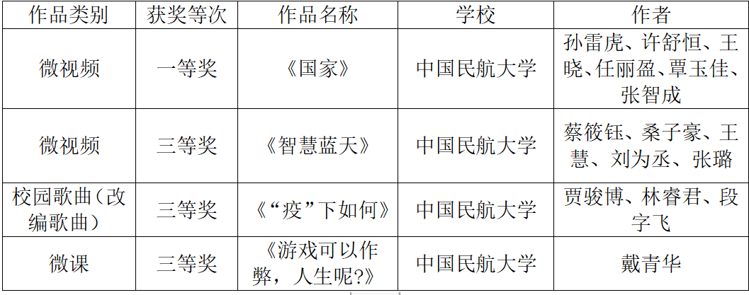 本网讯 近日,市委教育工委、市委网信办、市教委发布《关于公布“我们这十年”优秀网络作品展播暨2022年度天津市大学生网络文化节和天津市高校网络教育优秀作品推选展示活动获奖作品的通知》,在天津市大学生网络文化节中,中国民航大学获得了一等奖1项,三等奖2项,优秀指导教师1名;在天津市高校网络教育优秀作品推选展示活动中获得优秀微课作品三等奖1项。