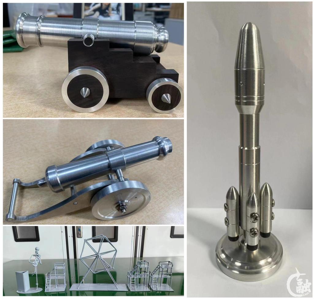 从左至右依次为:现代加工创意激光加工作品、创意数控电火花线切割项目作品、民航特色创意钣金加工作品