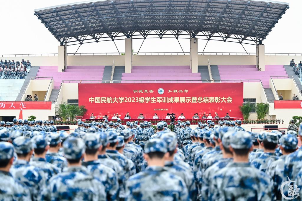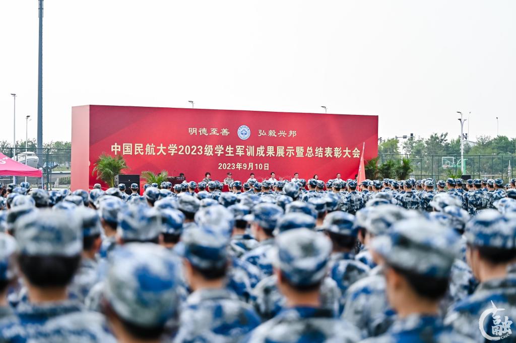 本网讯 9月10日,中国民航大学2023级学生军训成果汇报展示暨总结表彰大会在东丽校区南区西体育场、宁河校区体育场举行,校党委副书记赵洪海,副校长杨新湦,中国人民解放军32134部队副参谋长汝晓刚中校出席。学校相关职能部门、各学院负责人,承训部队教官,参训辅导员,以及2023级全体学生参加。