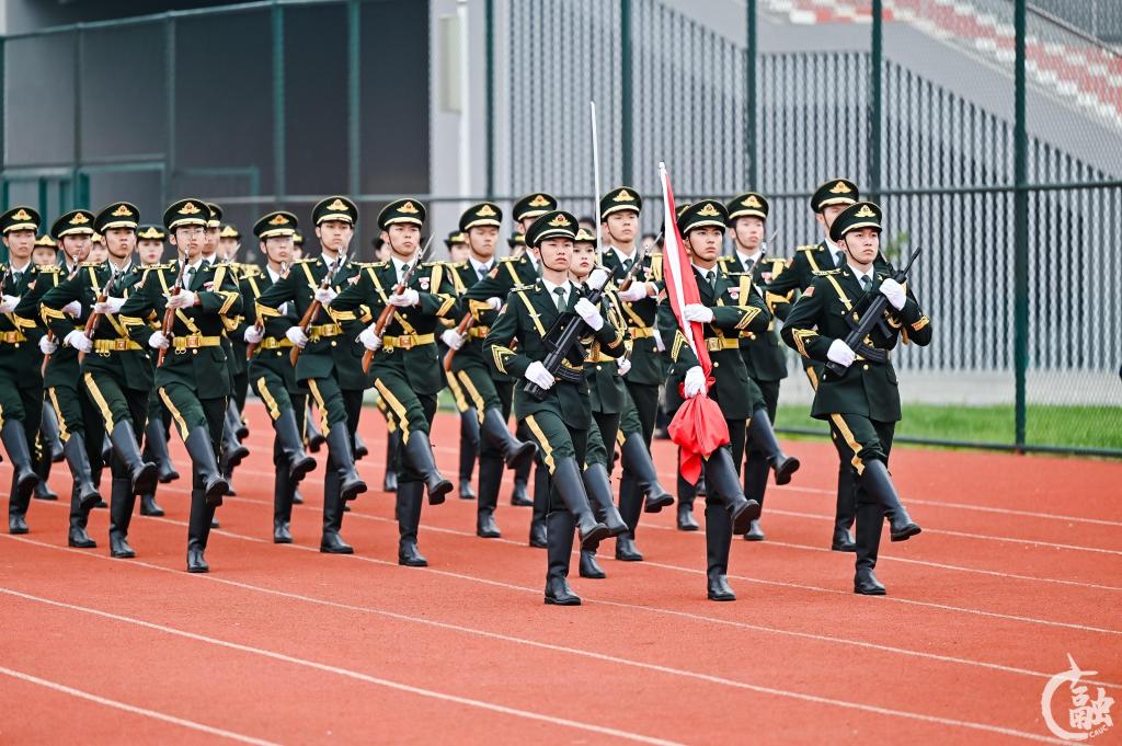 在雄壮的进行曲中,学生连队分列式方阵迈着整齐划一的步伐,喊着连队口号依次走过主席台,接受检阅。