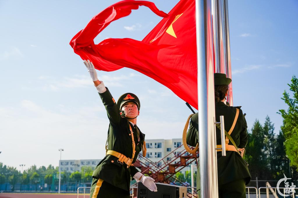 军训团团长刘帅向东丽校区各军训连授连旗,军训团副团长田泽向宁河校区各军训连授连旗。