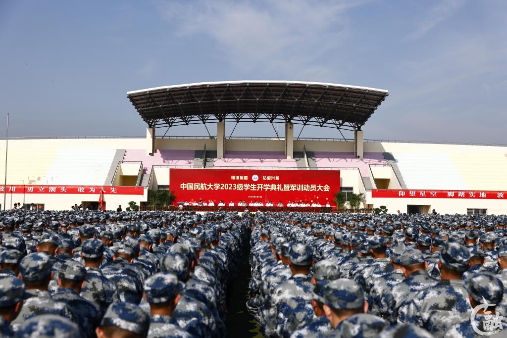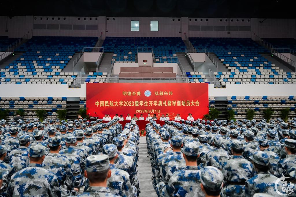 本网讯 9月1日,中国民航大学2023级学生开学典礼暨军训动员大会在东丽校区南区西体育场、宁河校区体育馆举行。校党委书记曹胜利,校长丁水汀,副校长杨虎、吴仁彪,校党委副书记赵洪海,副校长杨新湦,校工会主席王志强,东丽区人民武装部部长刘跃民大校,中国人民解放军32134部队副参谋长汝晓刚中校出席。相关职能部门、各学院负责人,教师代表,全体承训部队教官,以及2023级全体学生参加。赵洪海主持。