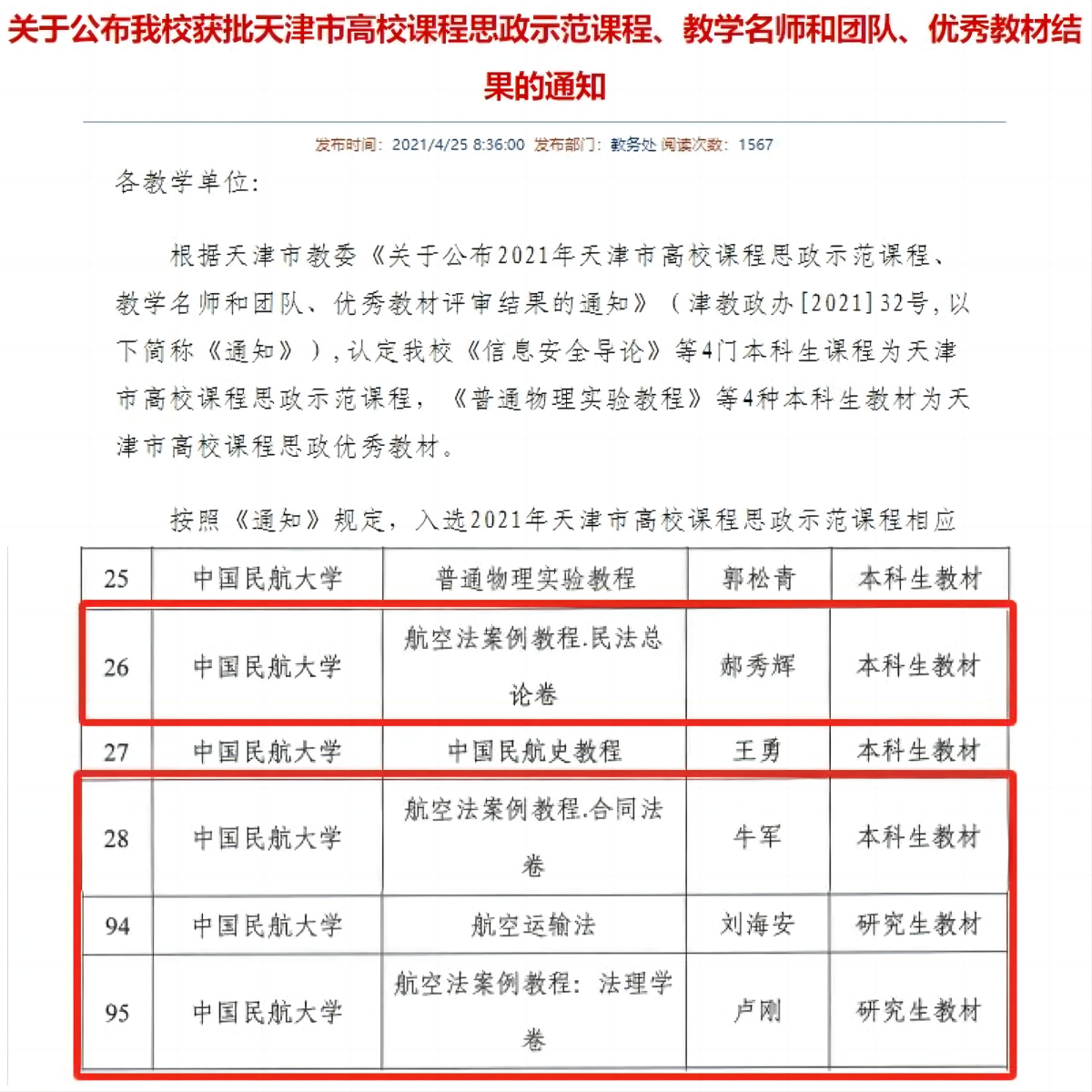 注重校本“特色课程-特色教材”一体化建设。教学团队积极以科研成果支持教学改革,实现教学科研互长。现已出版航空法特色理论教材、案例教材和法律实训指导教材及专著30余部并投入使用,其中获评天津市首批课程思政优秀教材4部、天津市第十三届社会科学优秀成果奖3部。