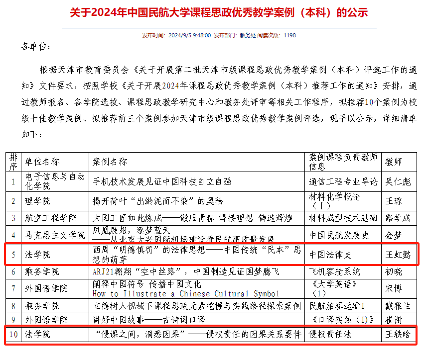 学院教师王虹懿、王轶晗荣获2024年中国民航大学课程思政优秀教学案例(本科)